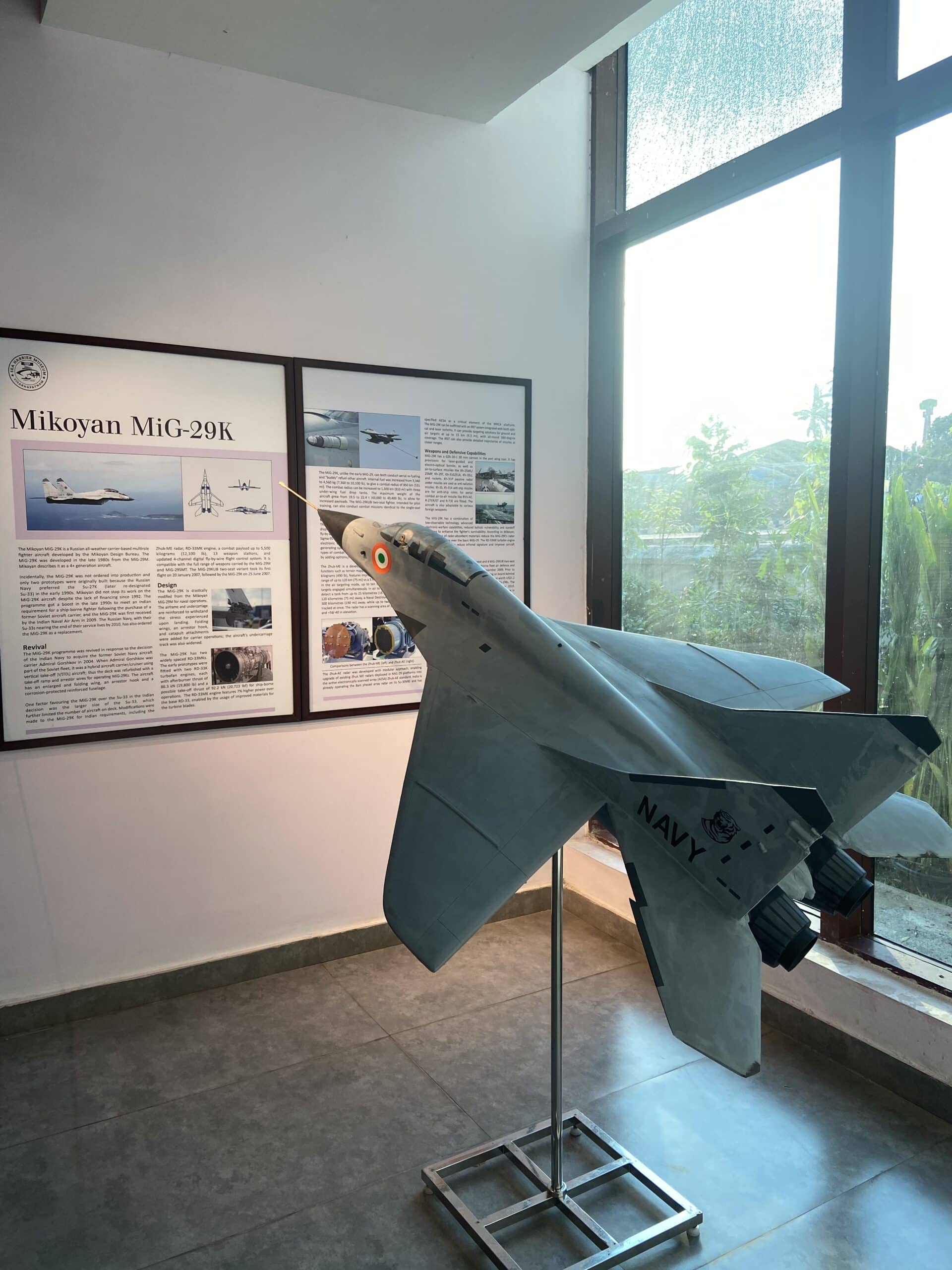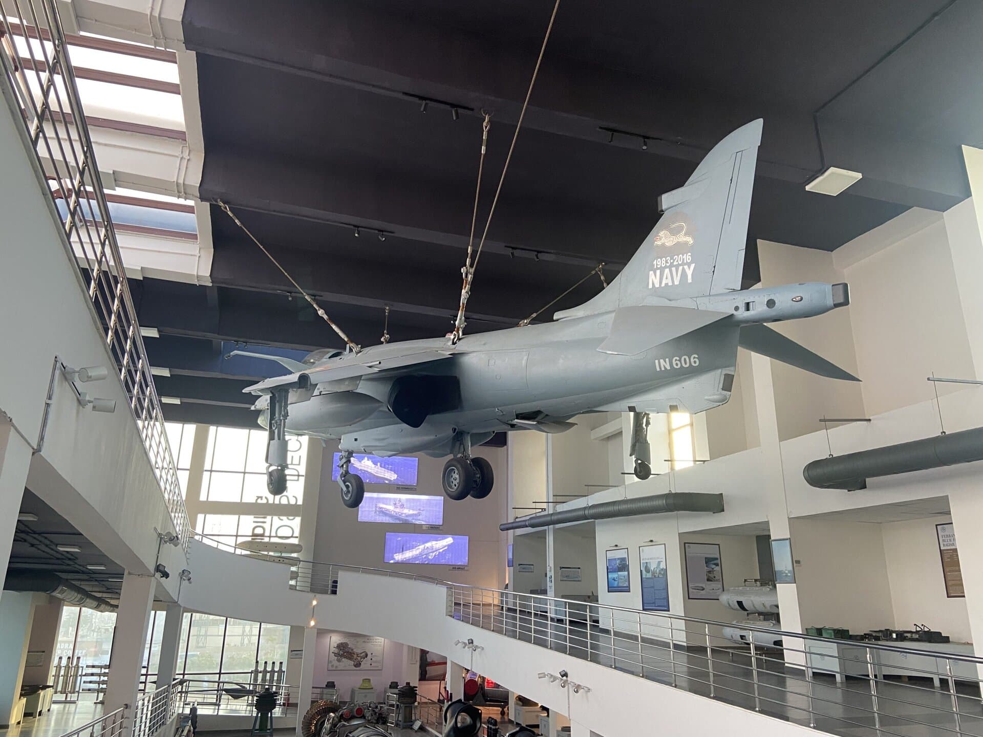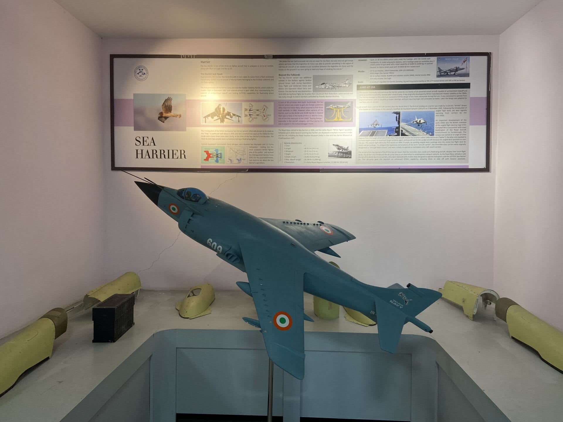 The Sea Harrier museum has a decommissioned Sea Harrier aircraft on display. The aircraft is hung from the ceiling. The museum showcases scale models of several aircraft used in the Indian Navy/Airforce, and all the components used in these fighter jets, like the engine, radars, missiles, pilot seat with ejection, etc. For Aircraft enthusiasts, this is a very interesting place to visit. At least half a day is required to thoroughly check out all the models. We had to rush through the museums because we had only a couple of hours.