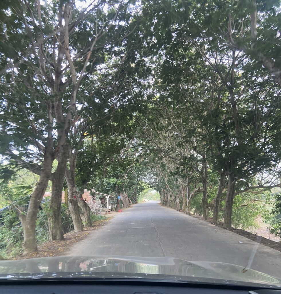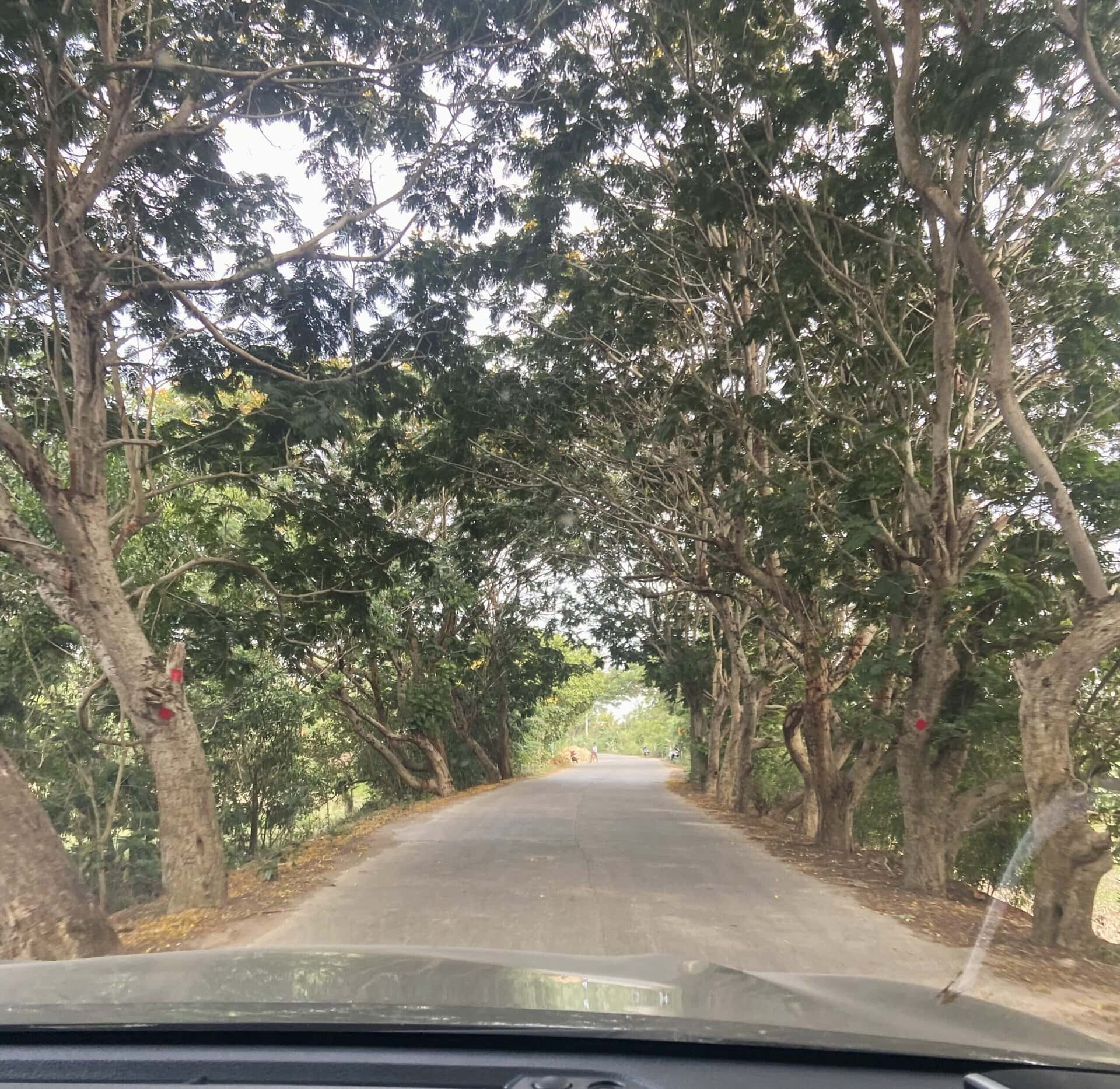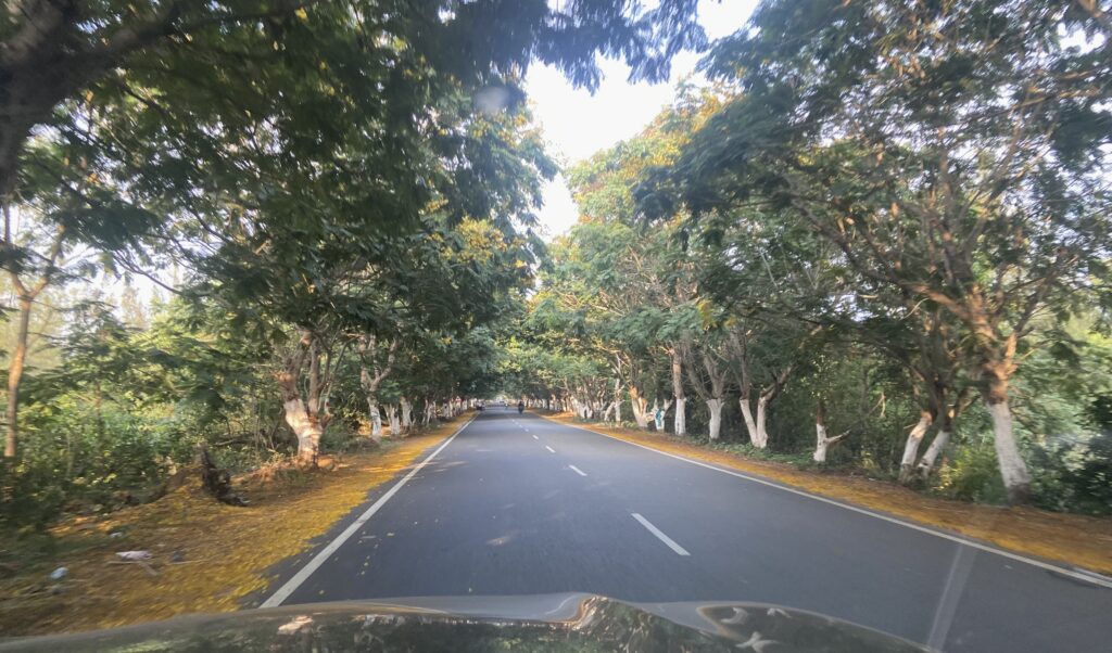 About 70 kilometers from Konark, we took an exit from the highway and entered 2 lane roads. The road was through several villages and greenery all around. Also, the roads were lined with trees on either side that was a beautiful sight. The last 20 kilometer stretch on the Puri-Konark beach road was lined with trees with yellow flowers. With the evening sun shining on these trees, the view was mesmerising. Below are a few pictures of the scenery on this 70 kilometer stretch.