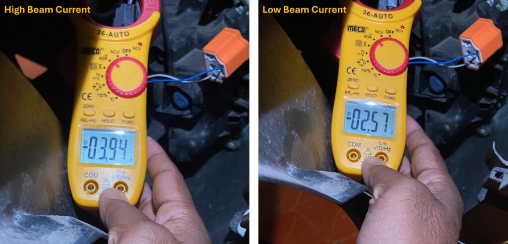 As the installer was opening up the front wheel well, I soldered the male H4 connector to the high beam cable of the projector. I also measured the low and high beam currents to make sure that the existing wiring can take the current. The total current with high beam was less than 4A, which should be easily handled by the existing wiring.