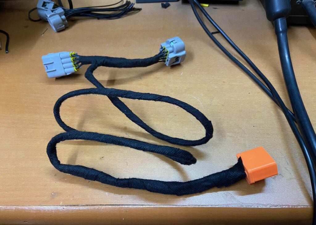 The below picture shows the completed harness with a female H4 connector at the end and the wires wrapped with TESA tape.