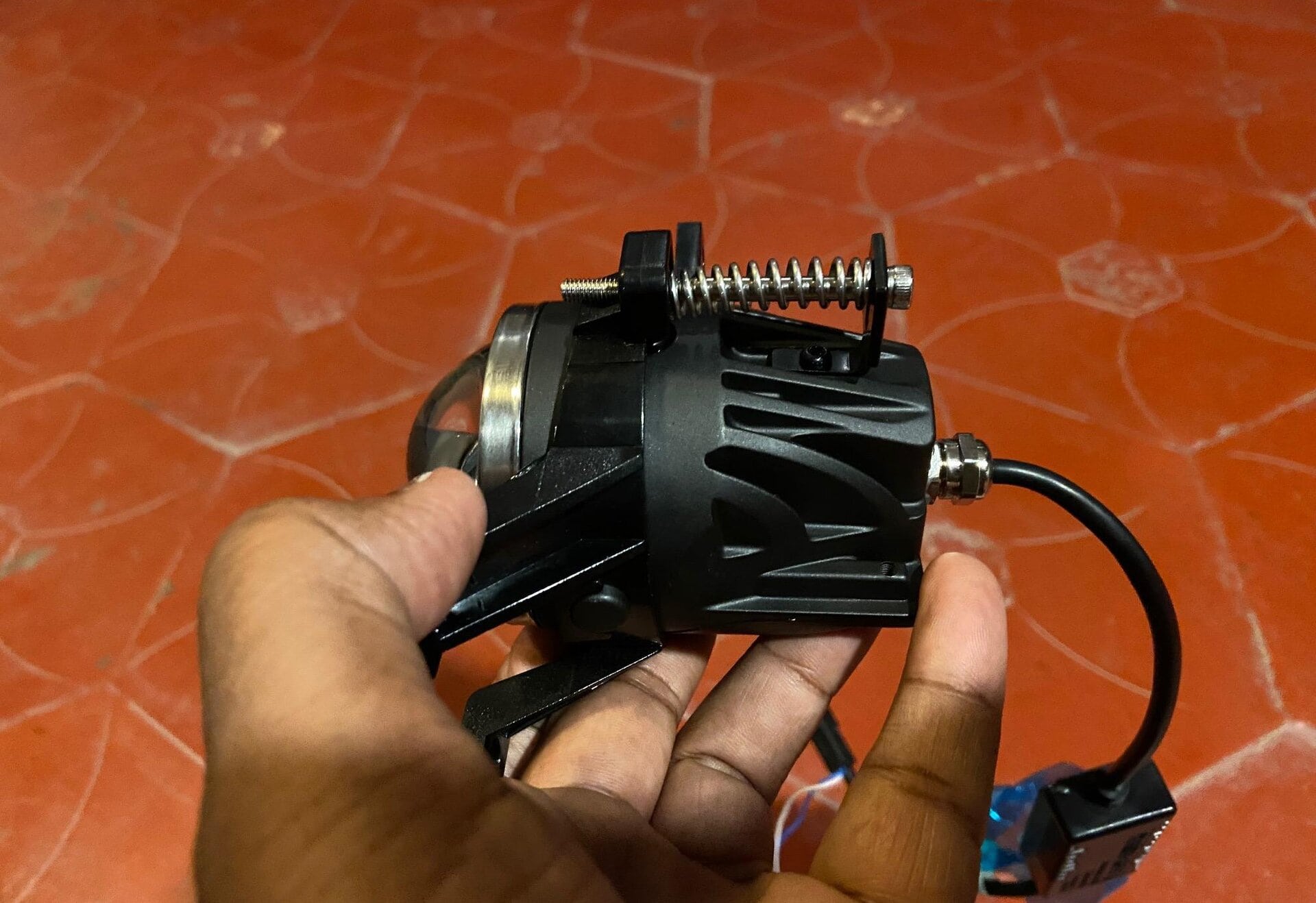 I found a dealer and installer in Coimbatore and paid them a visit. They showed me the projector and gave me a demo by connecting it to a power supply. The light output was quite good, and I liked the warm white option. Warm white provides more visibility compared to pure white in wet conditions. The dealer mentioned this installation is plug-and-play. However, during this visit, I found several problems related to the upgrade, and the installation was not plug-and-play.